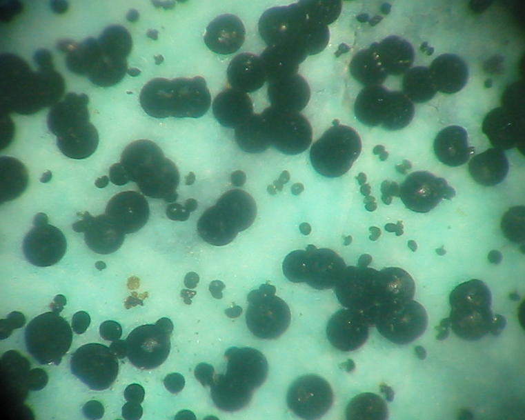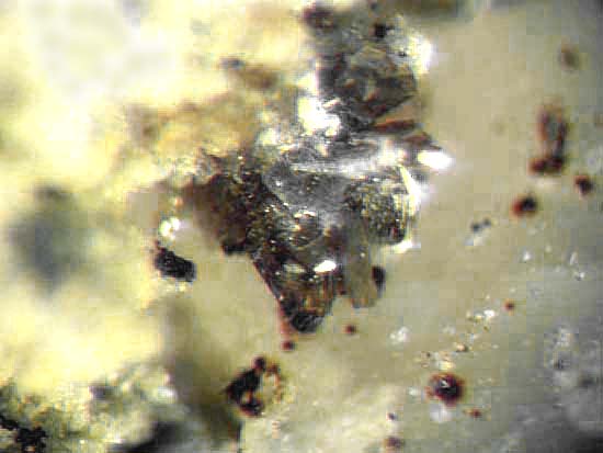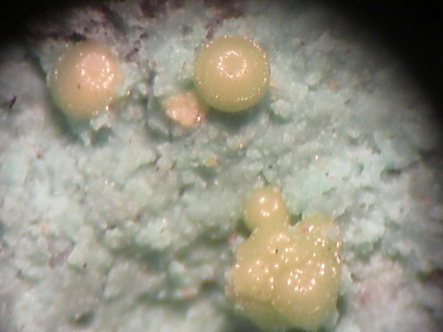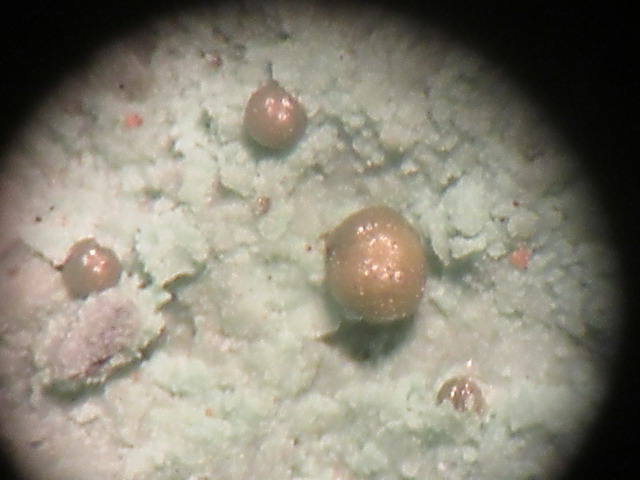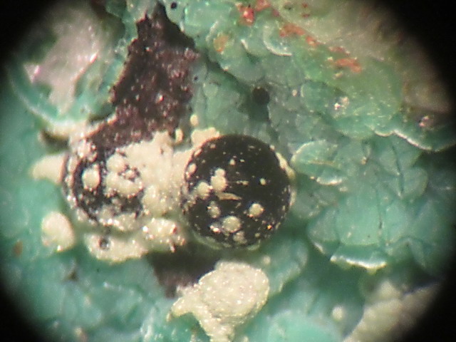 Das Wismutvanadat Hechtsbergit als hellbraune xx auf Chrysokoll.