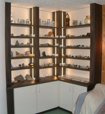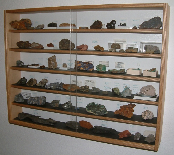 Er hat von reisefreudigen Bekanten Mineralien aus allen Gegenden der Welt mitgebracht bekommen, vor allen aus Häfen, die von Kreuzfahrtschiffen angefahren werden. Solche Mineralien sind natürlich schwer einzusortieren, wenn man den wahren Fundort nicht kennt, und oft auch nicht die Mineralbezeichnung.