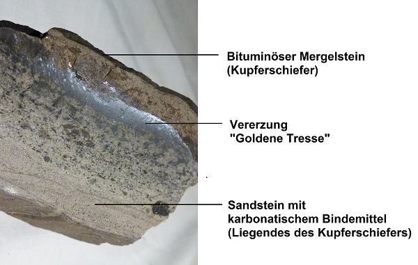 Vererzung im Liegenden (Weißliegendes) des Kupferschiefers.