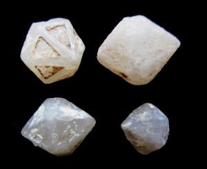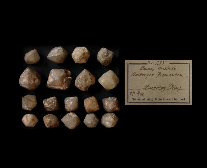 Im Wald am Auersberg bei Stolberg findet man diese heraugewitterten hexagonalenDoppelender- Hochquarzkristalle. Sie sind leider nicht klar, werden aber der Form wegen auch als Stolberger Diamanten bezeichnet.