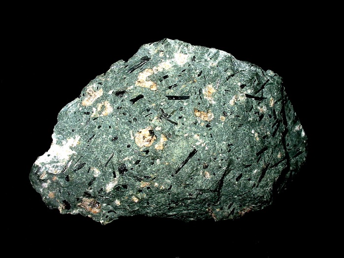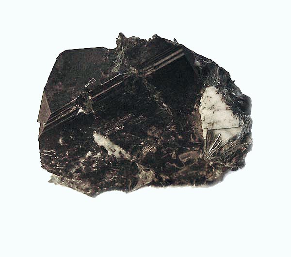 | Information: | Kleinstufe mit typisch schwarzen, länglich eingewachsenen Aegirin-Kristallen und Begleitern (Pfeil zeigt auf ein Mineral der Glimmer-Gruppe) von der russischen Kola-Halbinsel (Chibiny-Massiv). Apatit ist hier grünlich transparent. Natrolith = weiße Matrix |