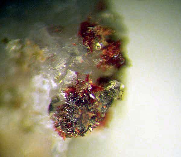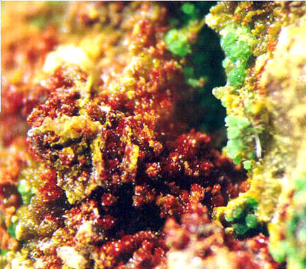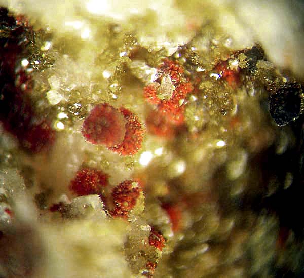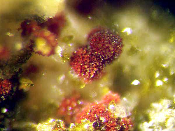 | Information: | Karminit xx in Begleitung von grünem Duftit aus der Grube Clara, Mikroskop-Aufnahme, Bildbreite 4 mm |