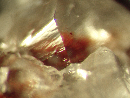 | Information: | Einschluss von "wolkigem" rotem Hämatit in Calcit, Bildbreite 4 mm |