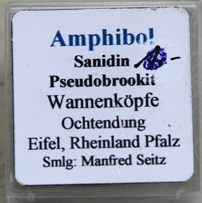 | Information: | korrekt: Amphibol-Gruppe xx, Sanidin, Pseudobrookit xx, Fundort: Wannenköpfe, Ochtendung, Eifel |
