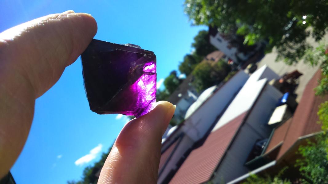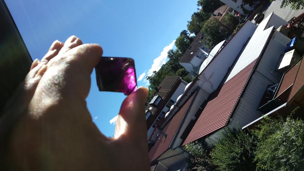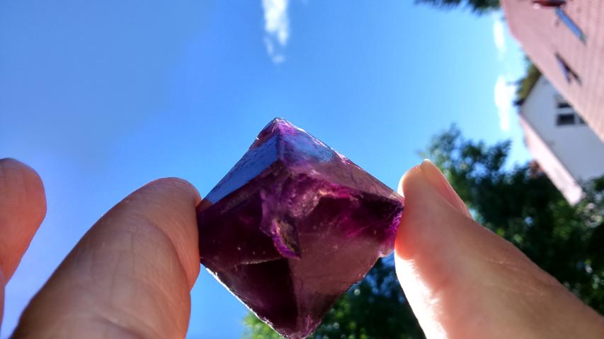 Hier wieder mal ein Stück, das ich nicht zuordnen kann. Hab es auf einem Flohmarkt gesehen und war fasziniert. Der Verkäufer meinte, es sei ein Amethyst. Ich selbst dachte: ein Fluorit.