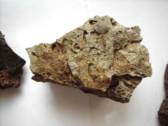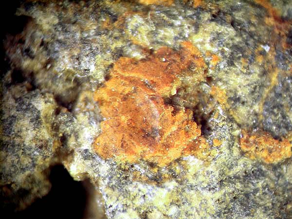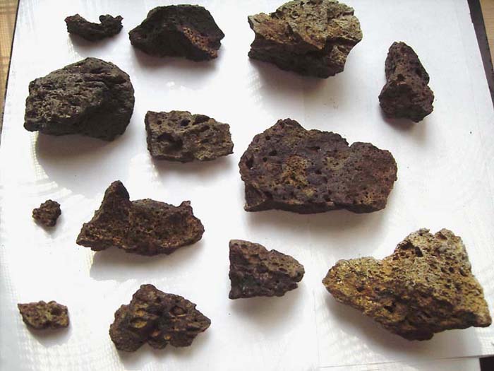 Gegen Mittag konnte ich dann nach Überqueren der unteren Brücke am Oberwaldsee wider Erwarten doch noch eine kleine Halde entdecken, die in das nebenstehende Waldstück hineinragt. Dort fand ich zahlreiche schlackig-poröse Basaltbrocken, die erst nach späterer Durchsicht die sowohl als Krusten / Rinden auf der Oberfläche der Basaltstücke als auch um die Ränder der blasigen Hohlräume herum oder darin die nachfolgend abgebildeten Minerale enthielten.
