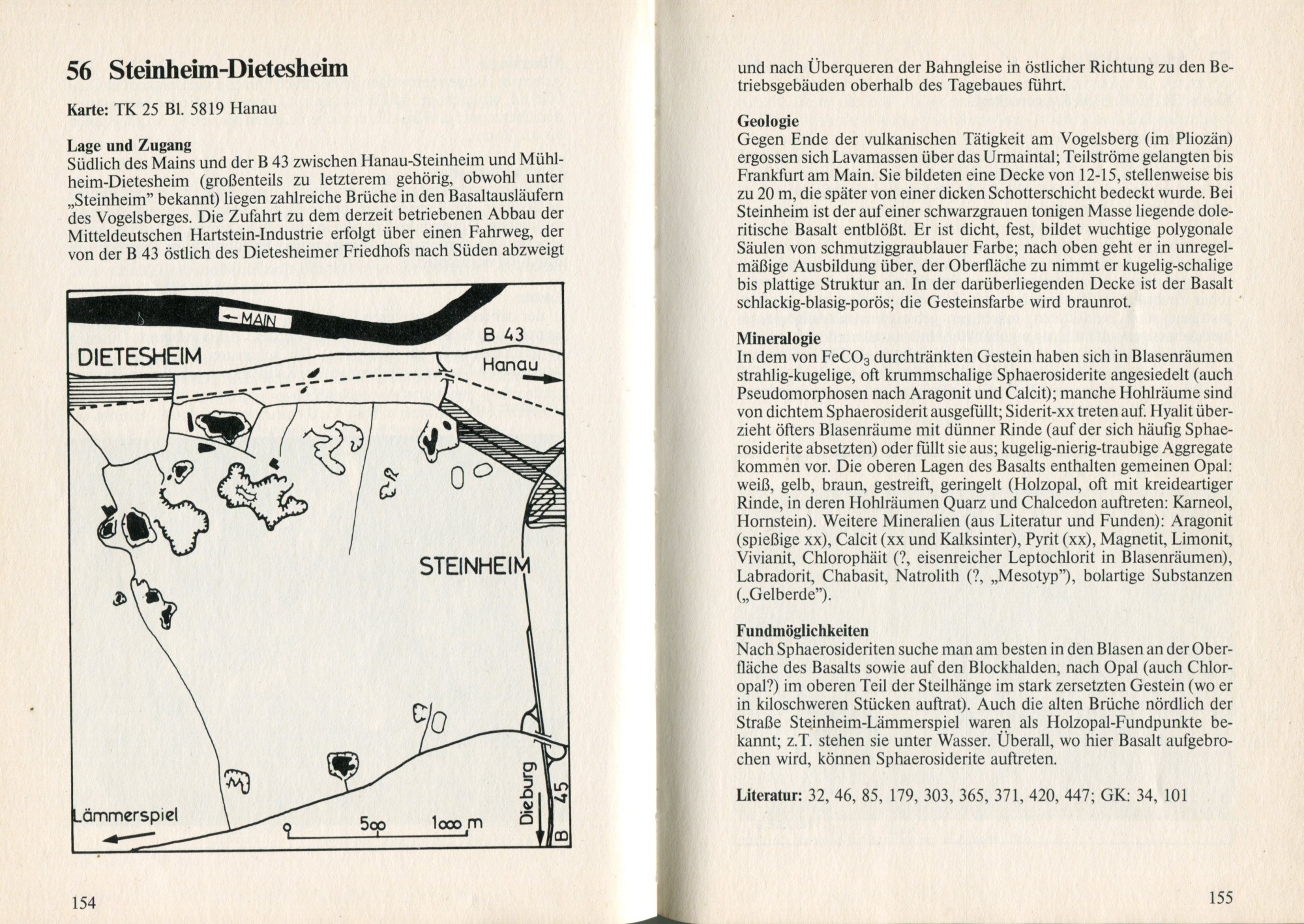 Am besten suchte man in den Blasen an der Oberfläche des Basalts nach Sphärosiderit sowie auf den Blockhalden. Nach Opal im oberen Teil der Steilhänge im stark verwitterten Gestein, das dort auch in z.T. kiloschweren Stücken auftrat. Auch die alten Brüche nördlich der Straße Steinheim-Lämmerspiel waren als Holzopal-Fundpunkte bekannt. Überall wo hier Basalt aufgebrochen war, konnten auch Sphärosiderite auftreten.