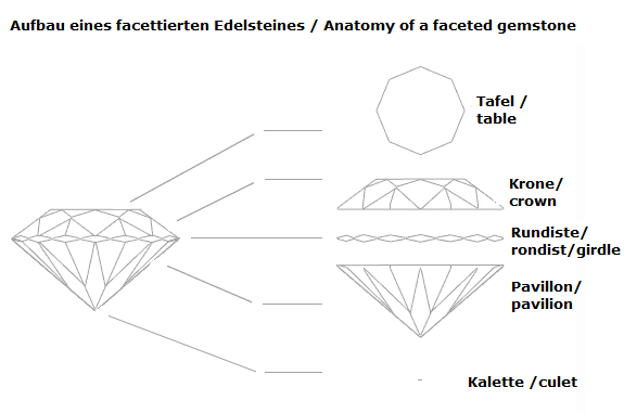 Bei Facettenschliffen liegt im Oberteil, in der sogenannten Krone, die mittig liegende Tafel, dann folgen die Tafelfacetten, die oberen Hauptfacetten und die oberen Rundistfacetten. Zwischen Oberteil und Unterteil liegt die Rundiste (Rondiste). Im Unterteil sind die unteren Rundistfacetten und die unteren Hauptfacetten angebracht. Die sogenannte Spitze des Pavillon nennt man Kalette, es handelt sich dabei um eine winzige Facette, welche die Bruchgefahr der sogenannten Spitze verhindert.