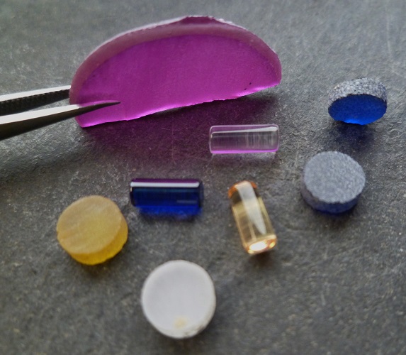 | Titel: | dünn gesägte Platten aus Halbbirne synthetisch Korund Rubin nach Verneuil als Vorbereitung zum Schleifen von Uhrenlagersteine l.JPG |