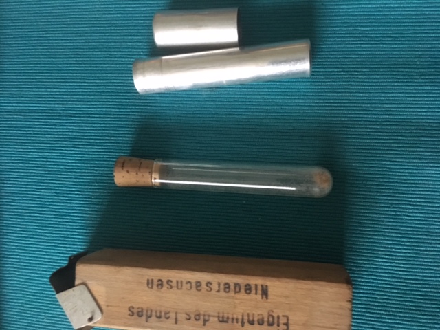 Auf der Holz-Verpackung steht "Eigentum des Landes Niedersachsen" (eingebrannt). Auf dem Kork-Deckel steht etwas mit nem blauen Stift, was ich aber nicht entziffern kann.