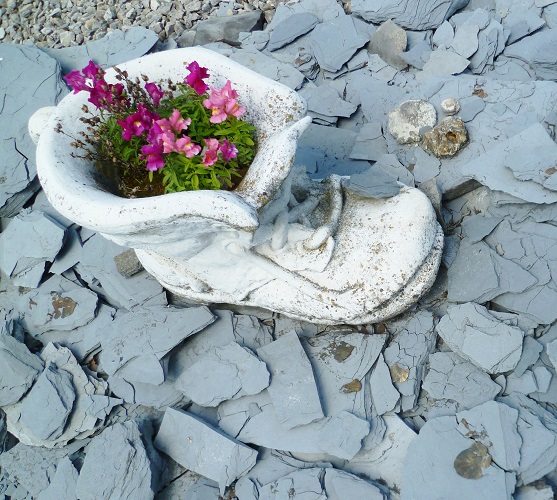 | Titel: | Gartengestaltung Löwenmäulchen im Garten-Deko-Stiefel auf Dotternhausener Schiefer mit Fossilien und pyritisierten Seelilien.JPG |