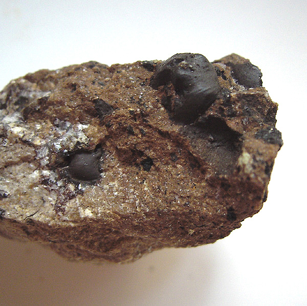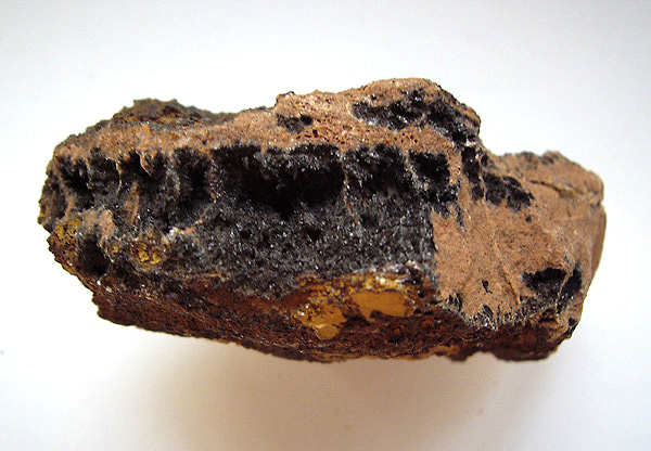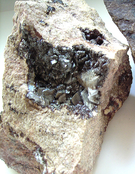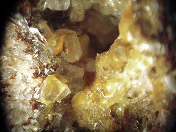 Auch fand sich Limonit / Goethit in schwarzgrauen Kugeln bis 7 mm Größe; ansonsten als Begleiter in Überzügen von gelber, bräunlichgelber, brauner und schwarzer Farbe. Eine Stufe mit reichlich Goethit (Glaskopf) weist herrliche bunte Anlauffarben auf. Das Eisenoxid Hämatit findet sich häufig als Begleiter des Calcits, sowohl als sog. “Eisenrahm“ in dunkelgrauen derben Überzügen, als auch als intensiv rote, wolkige Einschlüsse in Calcit-Kristallen sowie in braunroten bis roten Überzügen auf Calcit.