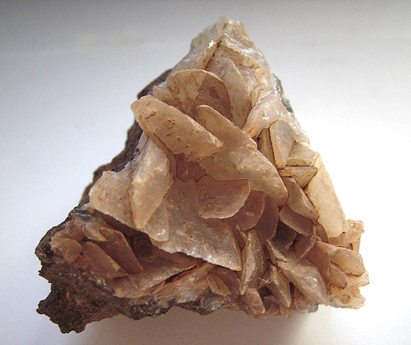 Besonders eine Stufe zeigt kleine aber schöne sternförmige Kopfflächen, die die typisch trigonale Symmetrie von Calcit zeigen (ähnlich einem “Mercedes-Stern“).