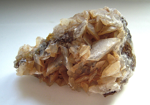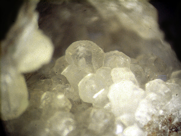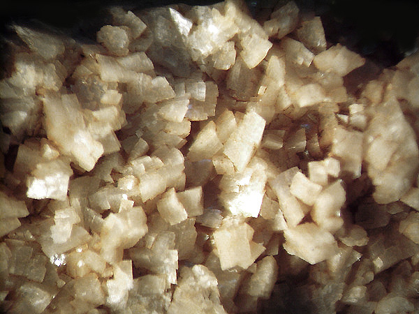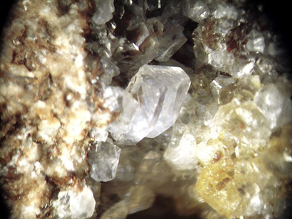 Zusätzlich konnte ich auf Klüften und in Hohlräumen einiger Brocken des Massenkalks auch kleinere, typisch sattelförmig gekrümmte Dolomit-Kristalle in den Farben blassrosa und gelblichweiß vorfinden. Diese kommen teils in Paragenese mit Calcit-Kristallen vor, teils ohne Begleiter.