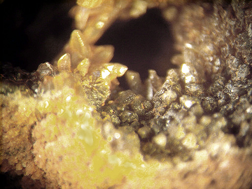 bestehen zur Zeit insbesondere beim Schuttkegel der ersten Strosse sowie auf der Strosse darunter. Gute Funde macht man übrigens nicht im blanken Kalkstein, sondern vielmehr im Kontakt Calcit zu Dolomit. Dort findet man in entsprechenden Hohlräumen und auf Klüften des Massenkalks mit etwas Glück und wenig Ausdauer die gewünschten Minerale, z.T. in attraktiver und manchmal auch kontrastreicher Ausbildung.