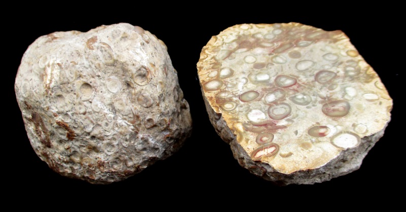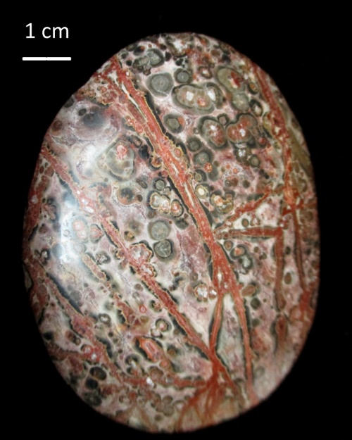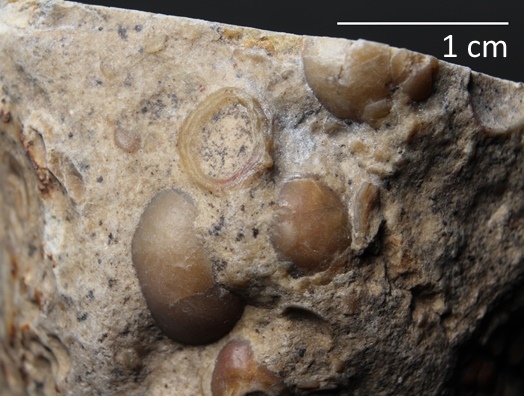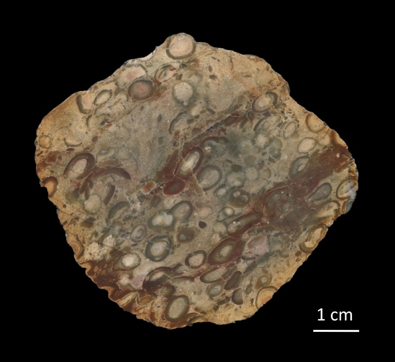 Im Steinkernforum, wo man sich mit Fossilien sehr gut auskennt, stellte sich aber recht schnell heraus, dass diese Strukturen nichts fossiles sind. Mir wurde der Stein geschliffen. Die Vermutung der Steinkernler bestätigte sich, es handelt sich um in vulkanischer Asche gebildete kugelige Aggregate: http://www.skan-kristallin.de/…olith.html .