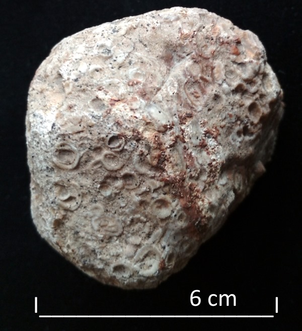 bei meiner Suche nach vorgeschichtlichen Artefakten fand ich auch diesen Stein in Mitteldeutschland als nordisches Geschiebe. Vermutete ich von der Form her einen neolithischen Klopf-,Schlagstein, zeigte sich dann oberflächlich ein ganz anderes Bild. Ich vermutete Fossilien darin.