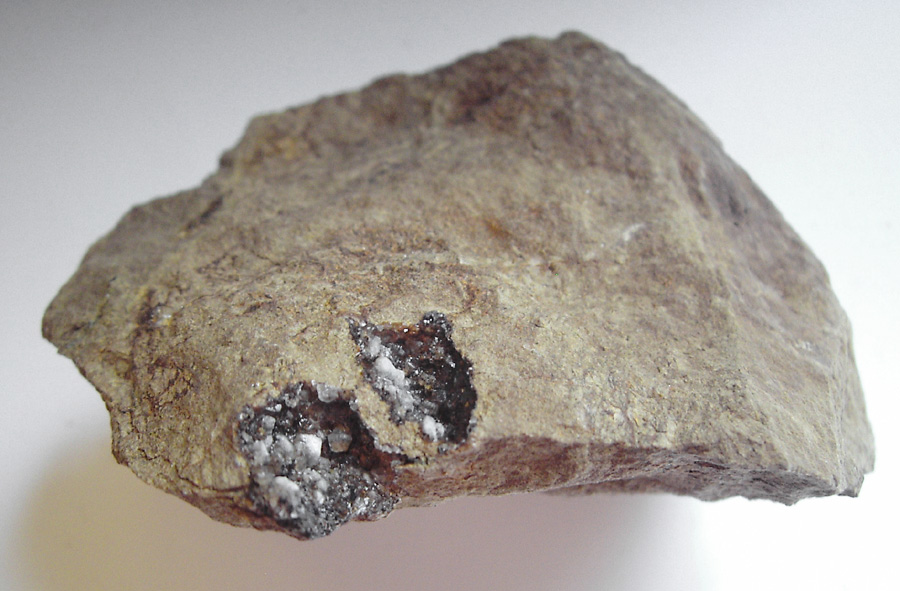 Zechsteindolomit mit Schwerspat-Trümern (Trum = verzweigtes Gängchen). In Drusen des Dolomits und des weißen Baryts (Schwerspat) z.T. schöne Kristalle von Calcit und Dolomit. Selten auch Beläge / Spuren von Malachit, Azurit und Chrysokoll. Diese sind sekundär aus Fahlerz-Körnchen im Baryt entstanden.
