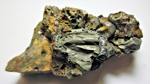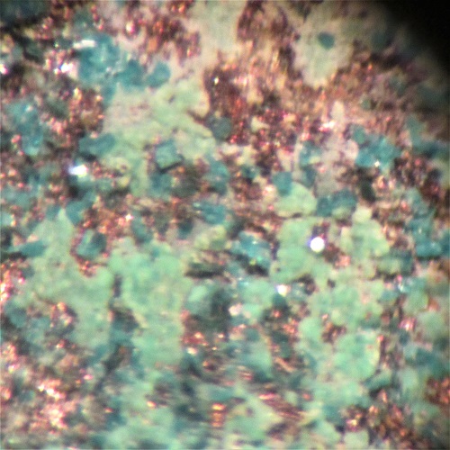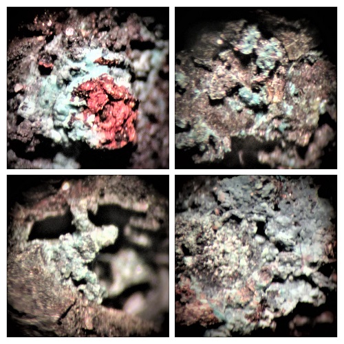 Kupferlocken,teilweise durch Tenorit schwarz und durch Spertiniit blau gefärbt, kommen relativ häufig vor.