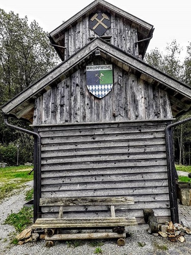 auf ein historisches Bergbaudenkmal aufmerksam. Der Scherlesreuther Schacht in der Nähe von Kropfmühl
