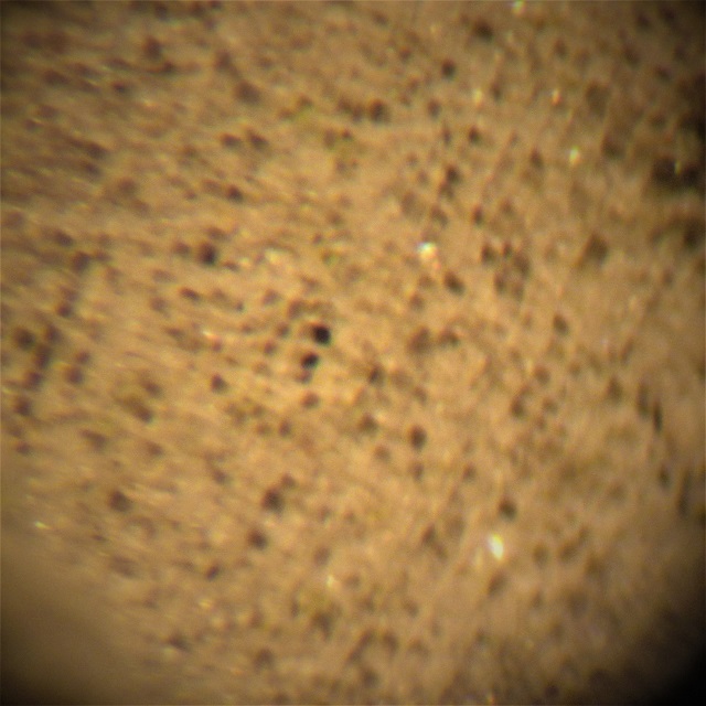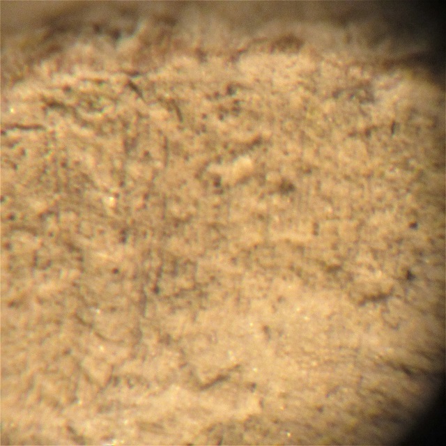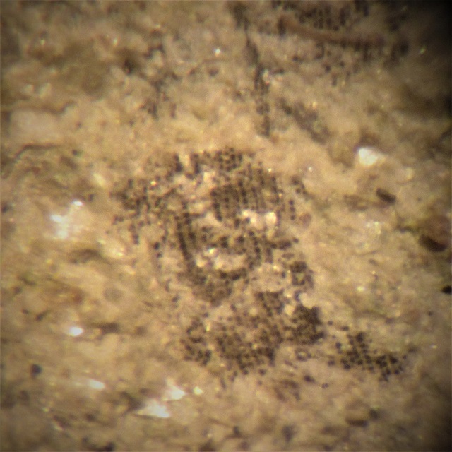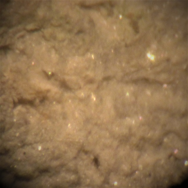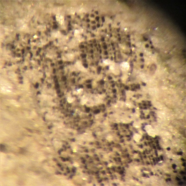 die mit Kaolinit überkrustet sind.Neben mehligweißen Anflügen sind unterm Bino kleine tafelige xx zu beobachten.