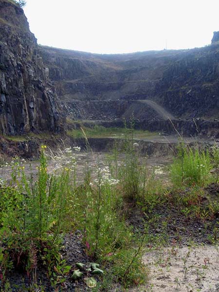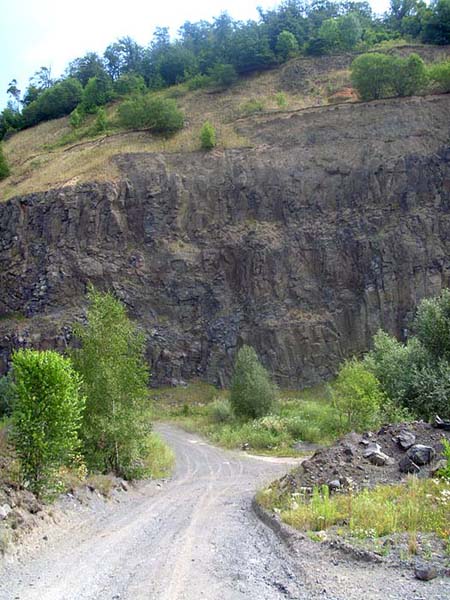 Geologie: Mächtiger Gesteinskörper aus mittelsaurem feinkörnigem Basalt, auf Phonolith aufliegend. Nur in den Blasenhohlräumen des "frischeren" und mehr dunklen Basaltes sind schöne Mineralien als hydrothermale Neubildungen zu finden! Insbesondere durch reichhaltige und ansprechende Funde von Zeolith-Mineralien wurde dieser Basaltbruch für Sammler bekannt. In den mehr verwitterten Basaltbrocken findet man jedoch meist nur Hyalit (Opal-Varietät) und Montmorillonit! Qualität und Quantität der Funde sind meist von der jeweiligen Abbausituation im Steinbruch abhängig!