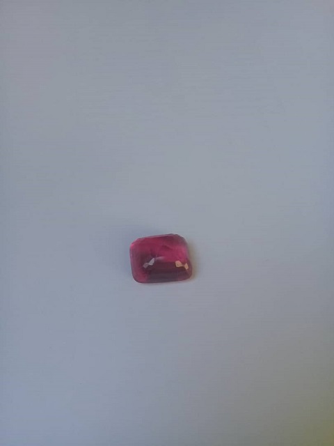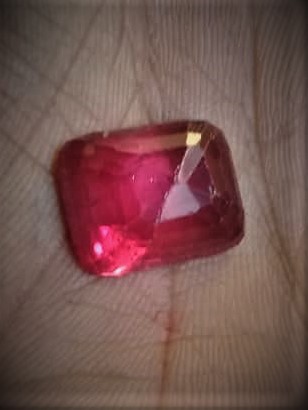 Es scheinen Einschlüsse sichtbar zu sein. Diese können natürlicher Art sein, aber auch auf Rissfüllungen aus Glas und/oder Harz hindeuten (das wäre dann ein behandelter Rubin, der deutlich weniger Wert wäre). Dann gibt es auch noch gutgemachte Synthesen, die auch mit Einschlüssen versehen sind und Glassteine, die Glasbläschen aufzeigen. Solche Dinge sieht man auf einem online-Foto nicht immer eindeutig.