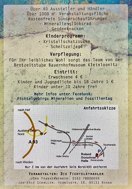 Wir möchten euch deshalb am 26. Mai nach Selb in die Roland-Dorschner-Halle zum 1. Fichtelgebirgs Mineralien und Fossilien Tag einladen.