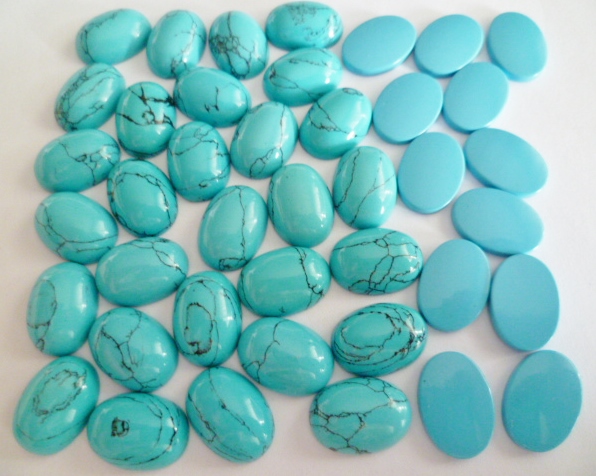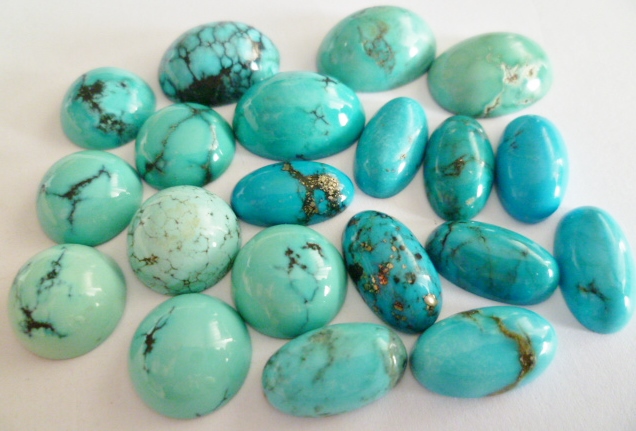 Türkise sind eher selten von reiner, blaugrüner Farbe. Viel häufiger findet man Türkise gesprenkelt mit kleinen Flecken oder mit braunen, grauen oder schwarzen, spinnenartigen Adern durchsetzter Matrix.