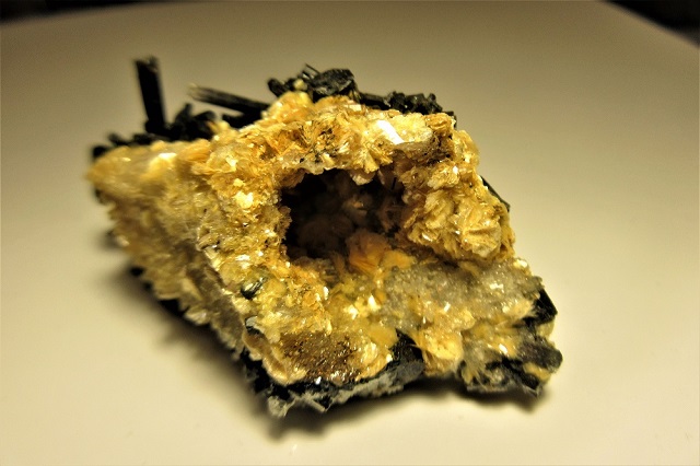 Auf Mikroklin und Aegirin sitzt dieser in Quarz und einem weißen derben Material umgewandelte Kristall vom Mount Malosa in Malawi: