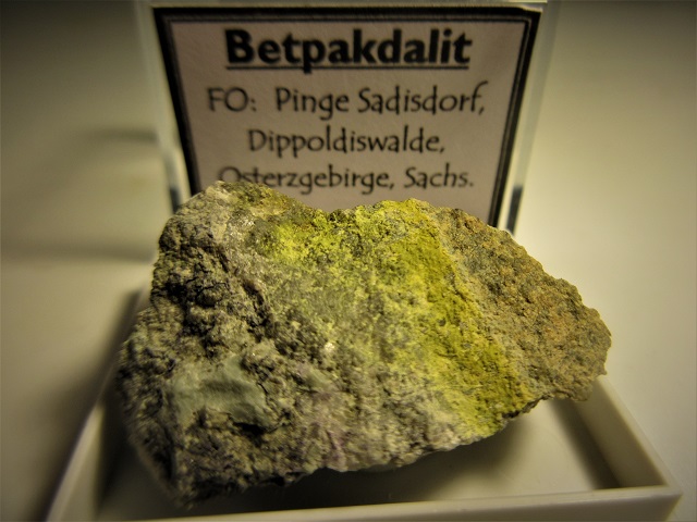 Eine Kleinstufe mit Betpakdalit aus der Sadisdorfer Pinge im Erzgebirge hat sich jetzt auch bei mir