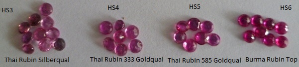 Almandin, Fluorit, Hyazinth, Pyrop, Rubellit, Spinell, Topas, Zirkon, Rubin-Imitationen wie synthetisch Korund, Cubic Zirconia, künstliches Glas, bedampfte und H.Y.T. oder TCF behandelte echte oder synthetische Materialien