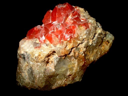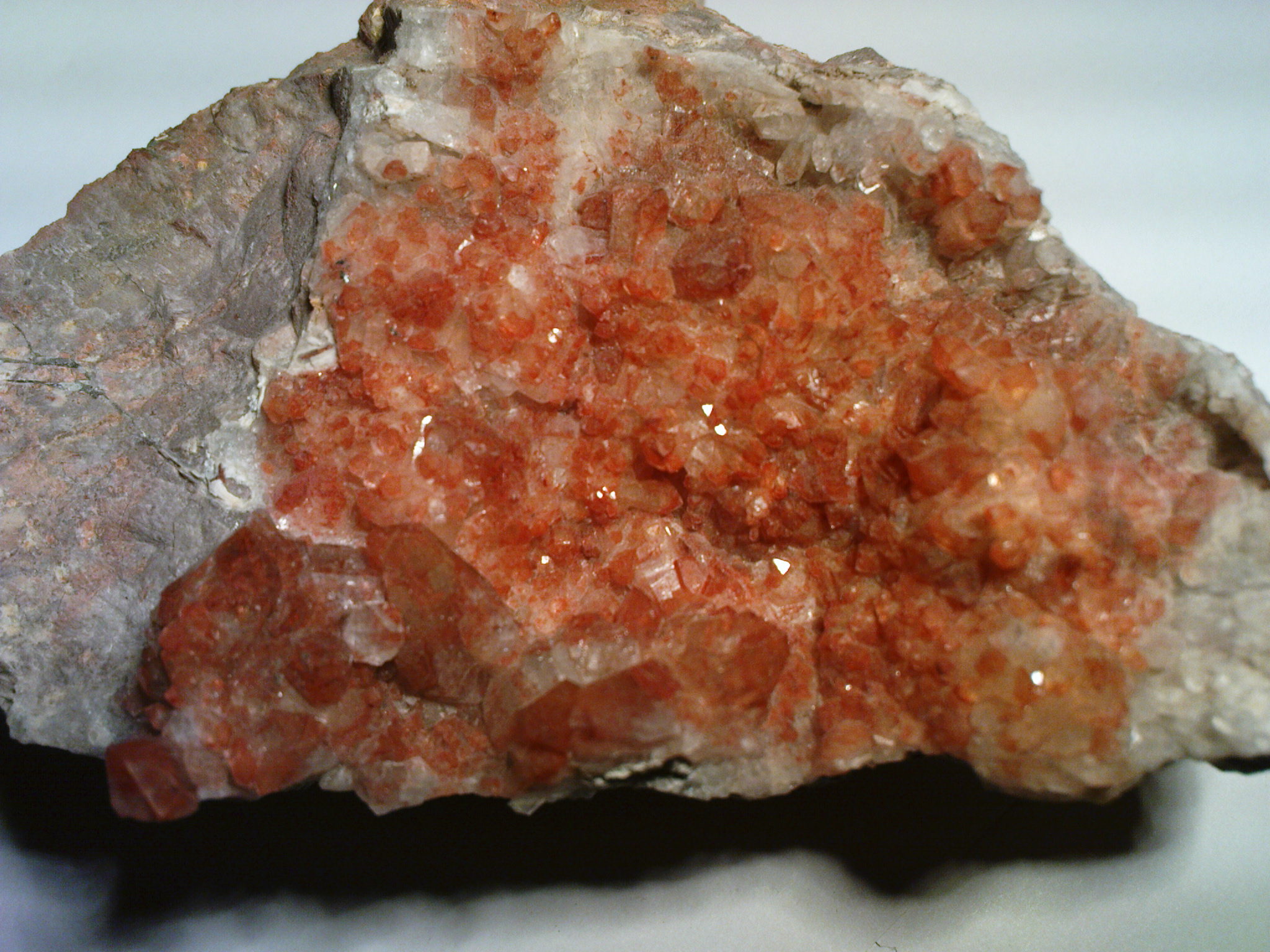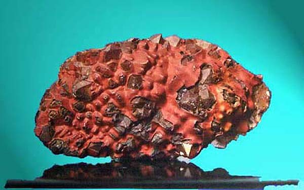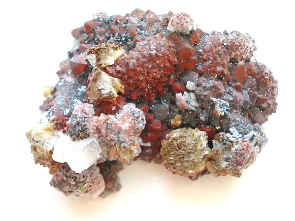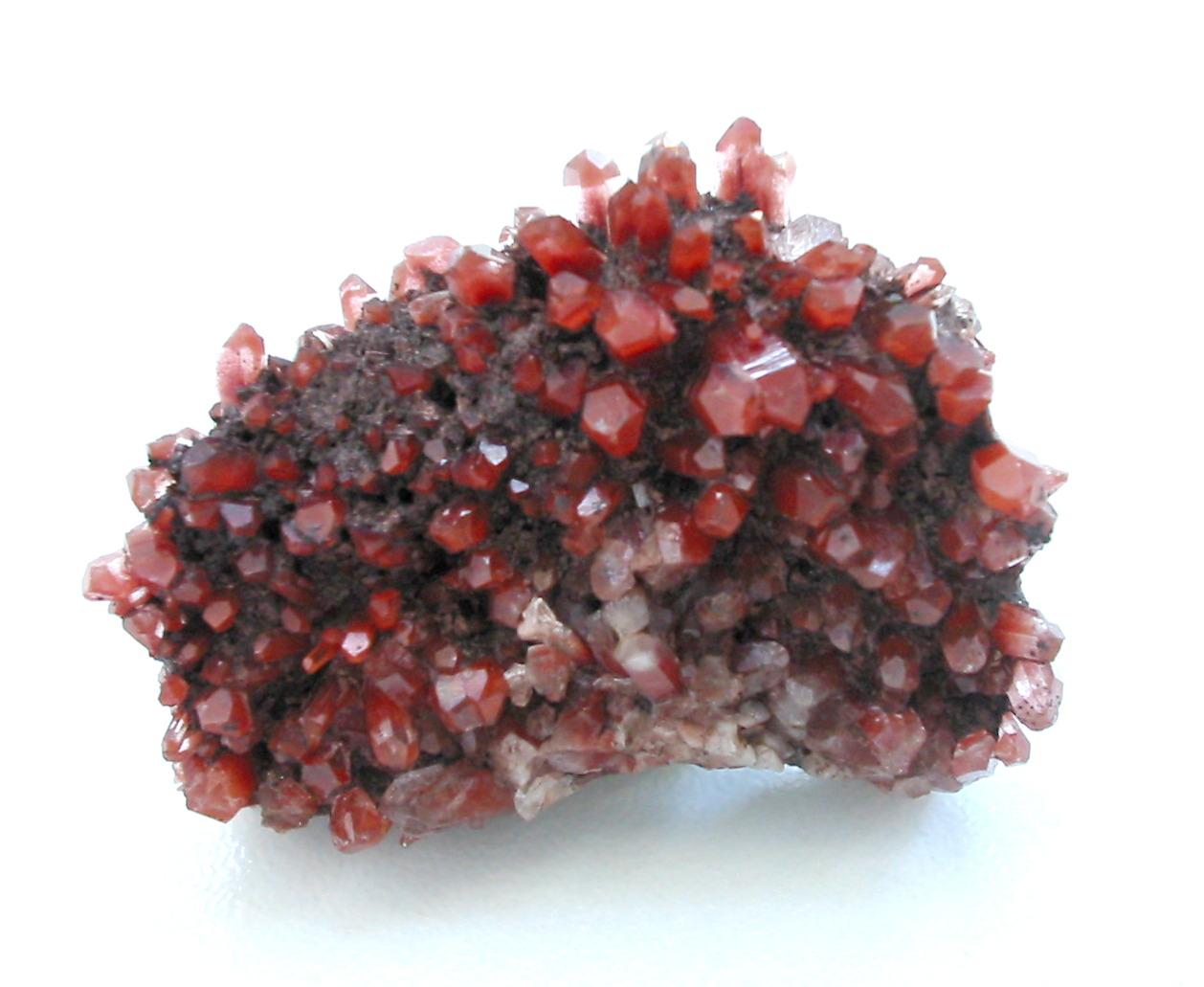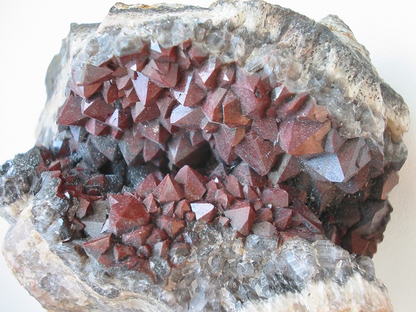 Blutrote Eisenkiesel-Kristalle mit Hämatit, Calcit, Chalkopyrit, Siderit und Dolomit aus einem Fund im Jahre 1908 auf dem Abrahamschacht bei Freiberg/Sachs. |