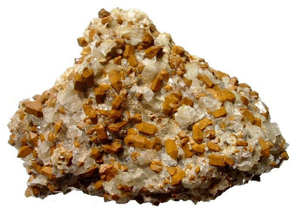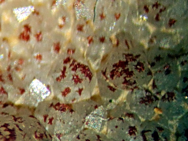 Leberbraune Eisenkiesel xx bis 1 cm "schwimmend" in Calcit, ein Klassiker von Johanngeorgenstadt im Erzgebirge. |