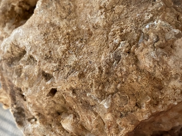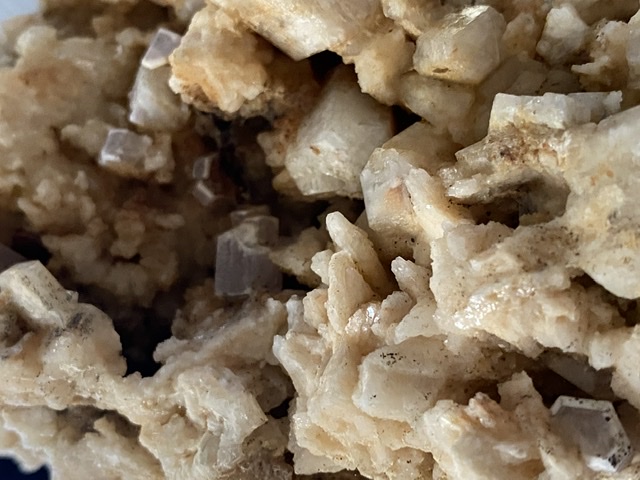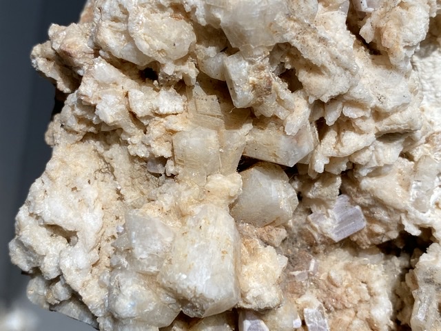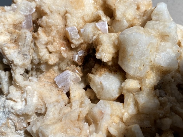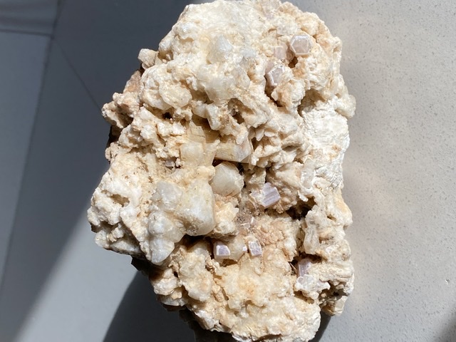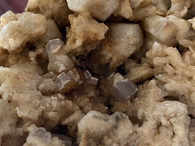 Bei dem nächsten Mineral habe ich keine Vermutung. Es hat bei Lichteinfall einen schönen Schimmer und einzelne Kristalle wirken schwach lila schimmernd.