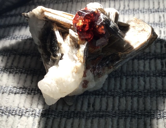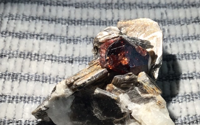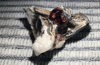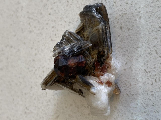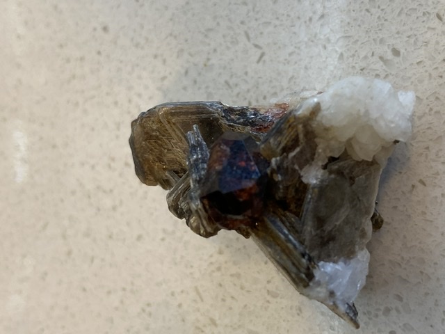 So hier eine Stufe wo ich einen Granat umgeben von Glimmer vermute. Länge 2,5cm. Ursprung vermutlich Pakistan oder angrenzende Gebiete.