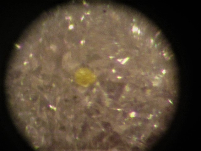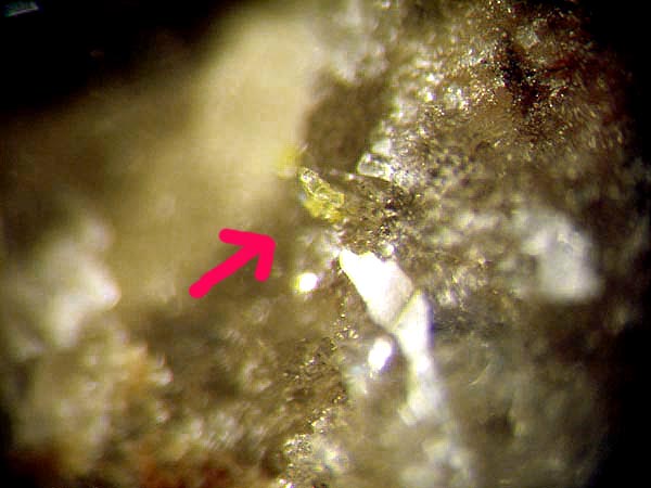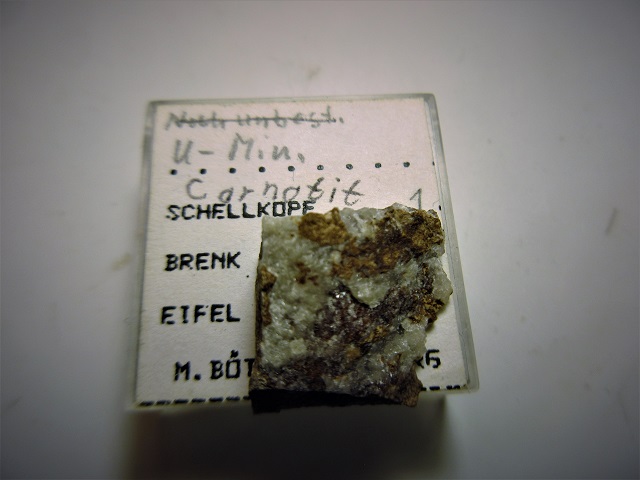 Das Etikett bei meinem Stüfchen zeigt die Entwicklung des Namens vom noch unbestimmten Uran- Mineral zum Carnotit. Der jetztige Name steht auf der Rückseite. Sollte Vandermeerscheit einmal diskredidiert werden, hab ich noch Platz auf dem Deckel der Dose für einen anderen Namen.