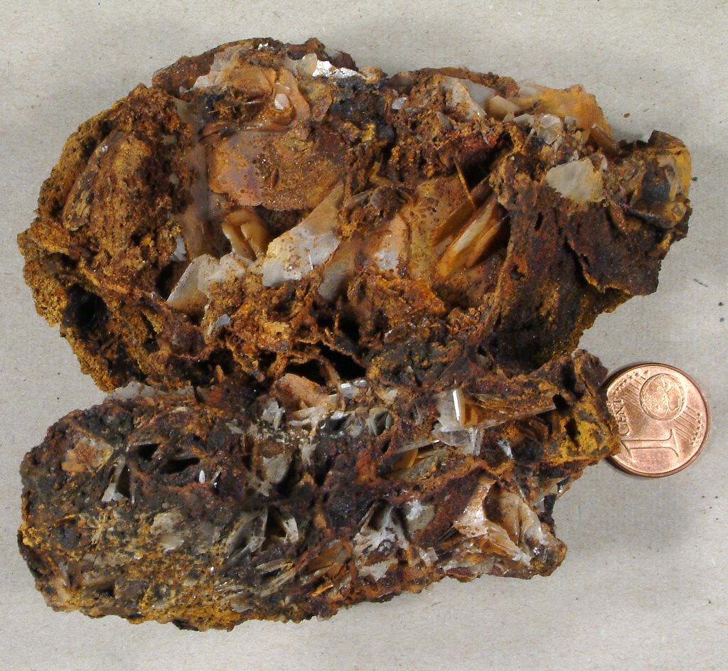 Die schwarzen Partien halte ich für ein Gemenge aus Mangan- und/oder Eisenhydroxiden (Limonit / Psilomelan). Das Calamin könnte evtl. nur mikroskopisch oder per Lupe erkennbar sein. Das wird dann aber überwiegend das Zinkmineral Hydrozinkit (evtl. weißlich oder grau auf der Stufe) sein oder auch das Zink-Carbonat Smithsonit, das sehr häufig in Lavrion vorkommt. Alle diese Minerale stehen auch in der Mindat-Liste zu diesem Fundort. Das würde also alles passen. Nur den Baryt halte ich doch eher für Siderit.