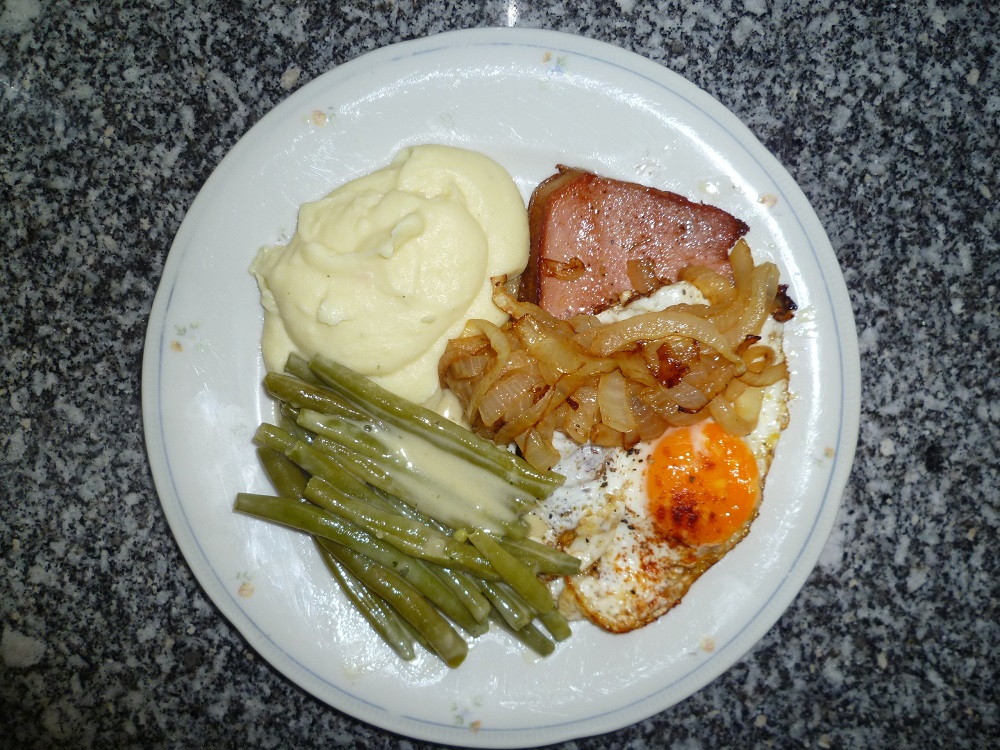 Da ich Spätaufsteher bin (nicht vor 9.00 Uhr, selten früher) und dann meine ersten Arbeiten erledige, ist es oft schon 11,30-12.00 Uhr. biis ich zum Frühstücken komme. Klar, dass man dann um 13.00 Uhr nicht schon wieder Hunger hat. Also gibt's dann erst um 17.00 Uhr was. Entweder schnelle Küche (Pizza) oder wie heute noch schnellere Küche: Kartoffelsalat (selbstgemacht) und kaltes Sülzkottelett.