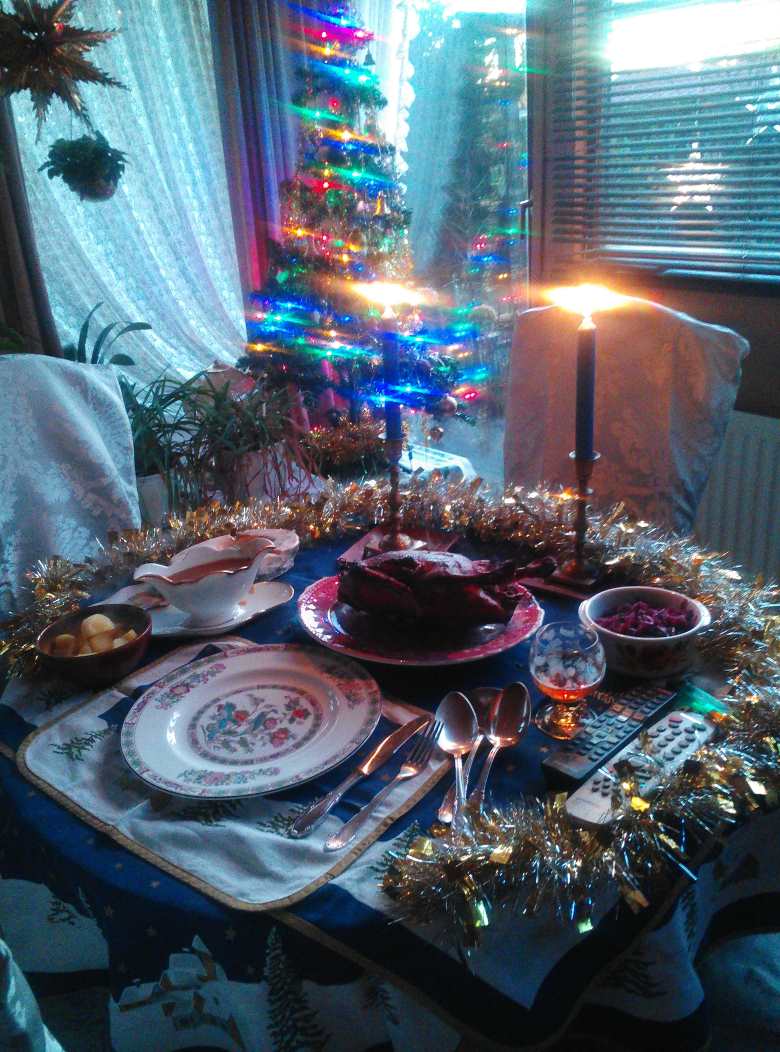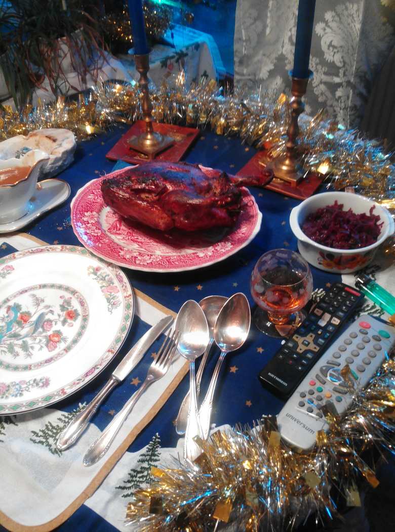 Heiligabend war schon immer der Tag des gepflegten Essens. Als meine Eltern noch lebten gab es immer die Weihnachtsgans. Erst Bescherung und dann das Essen. Die Gans hat mein Vater fast immer beim Skarspielen gewonnen und die war über 3800 gr. schwer und reichte für 3 Tage, dazu gibt es bis heute Rotkraut und Salzkartoffeln und die Soße vom Braten.