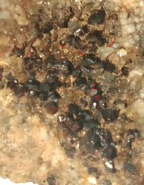 Leider kann ich auf den Fotos nicht viel erkennen. Sind die Kristalle mehr messinggelb und metallisch-glz.?, dann kann es schon mal kein Granat sein. Das würde dann für Pyrit sprechen, wobei ich aber auch Chalkopyrit (Kupferkies) nicht ausschließen möchte. Wenn dunkler von der Farbe her aber trotzdem noch metallisch-glänzend, dann könnte es auch dunkel angelaufener Pyrit sein.