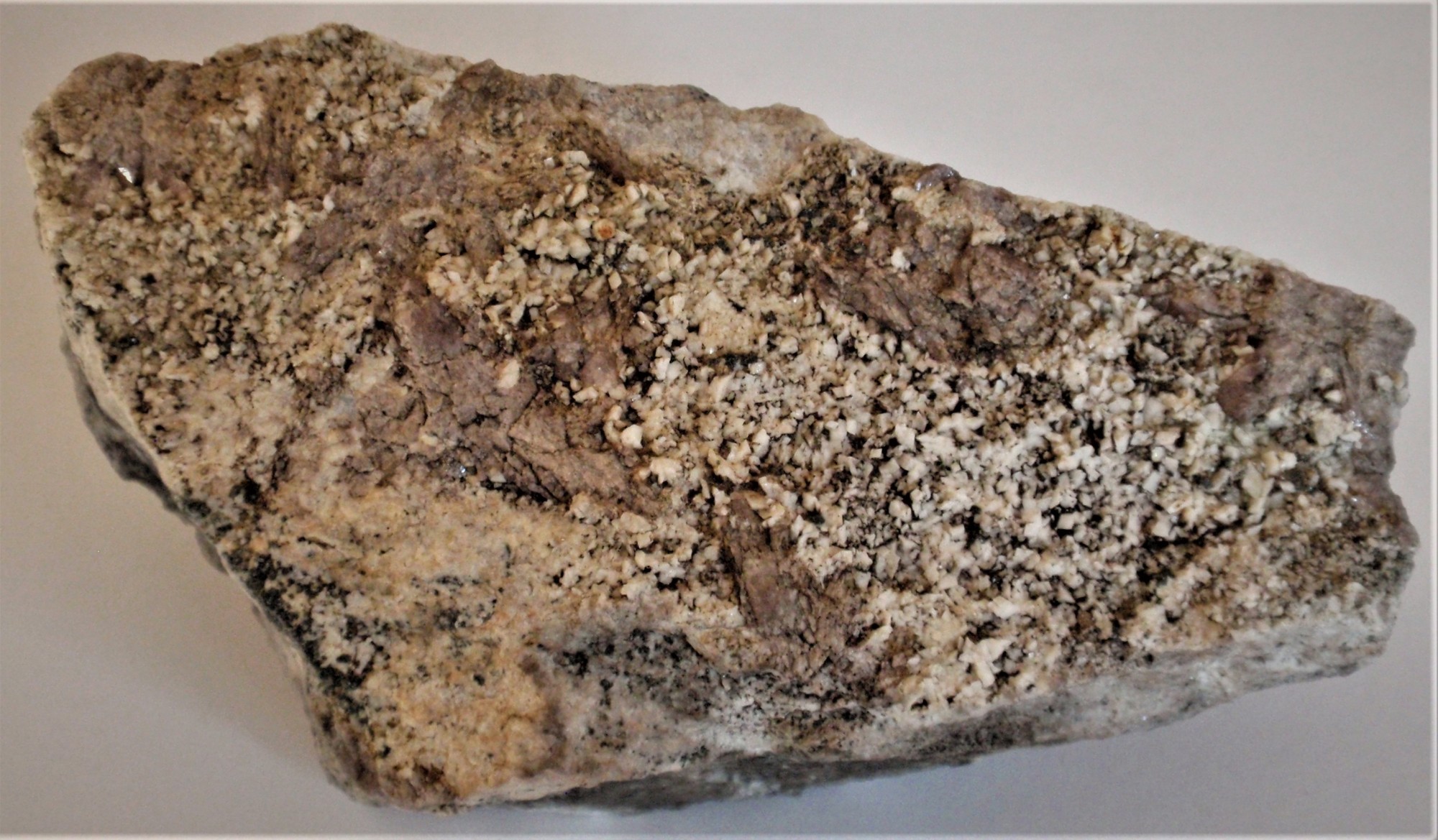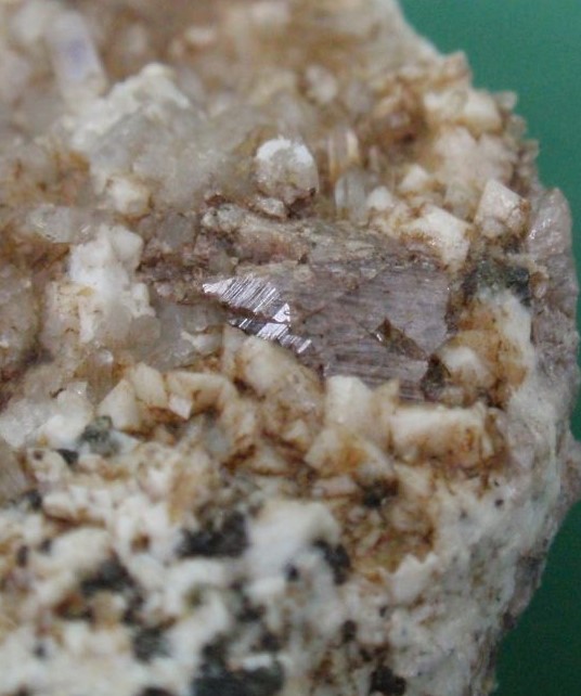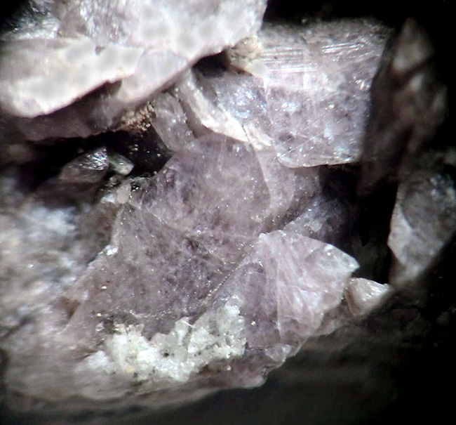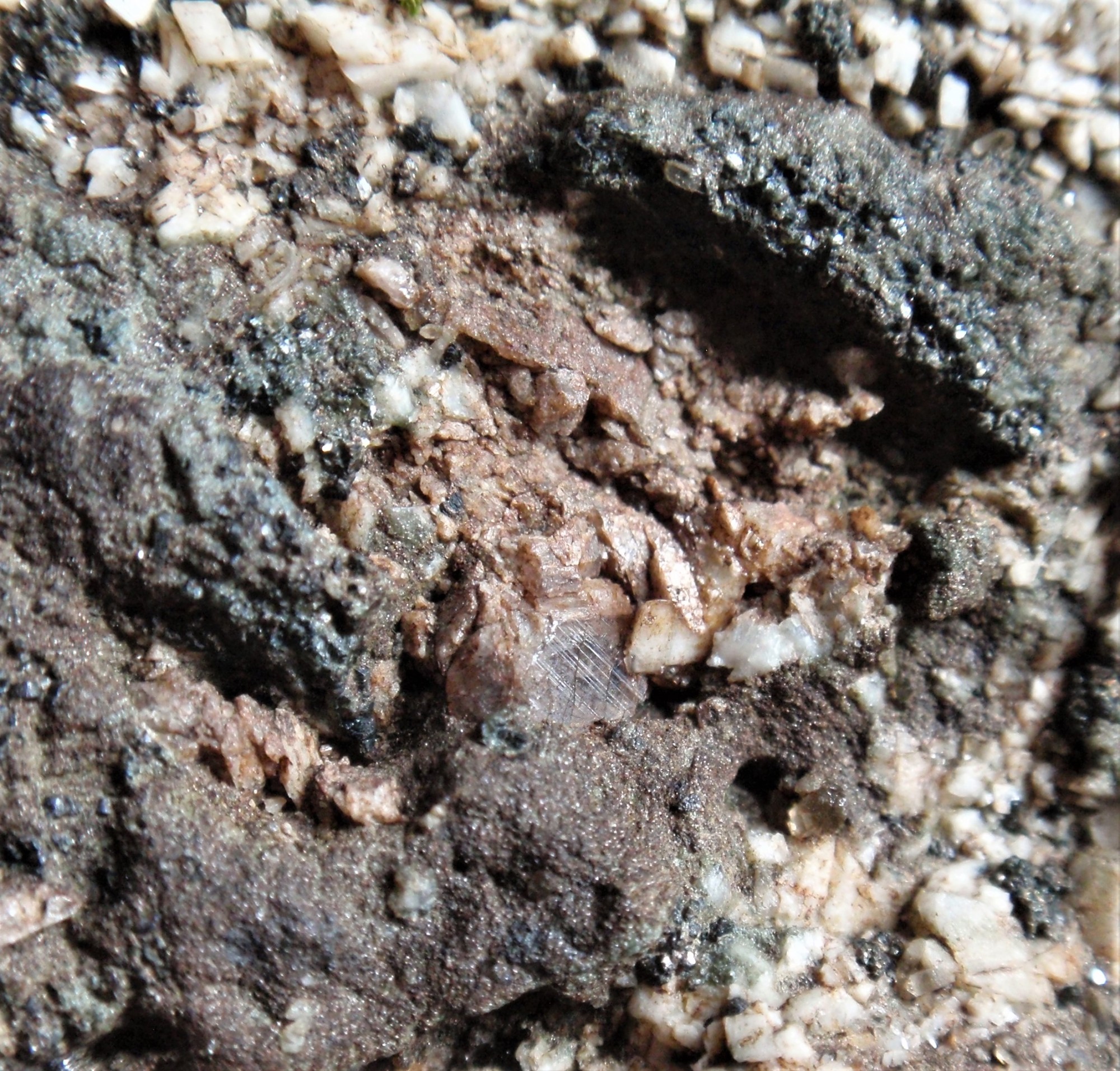 Amphibolit mit Quarzknauern und Feldspatschlieren: Darin derber Axinit oder in Klüften bzw. Hohlräumen fliederfarbene oder blass grau-violette Axinit xx (bis 1 cm), Albit xx, Quarz xx und weitere Mineralien.