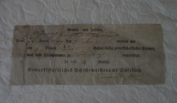 Der Erzfuhrzettel diente zur Kontrolle von Erzlieferungen an Zollgrenzpunkten. Hier ein Exemplar aus dem Eisenerzrevier Sulzbach in der Oberpfalz. Text: "Nro. 13 Anno 1837 den 11. März werden mit auf 1 Wagen Vier Seidel hiesig gewerkschaftlicher Eisenerz nach dem Eisenhammer zu Döhnberg verabfolgt. Id est 4 Seidel."