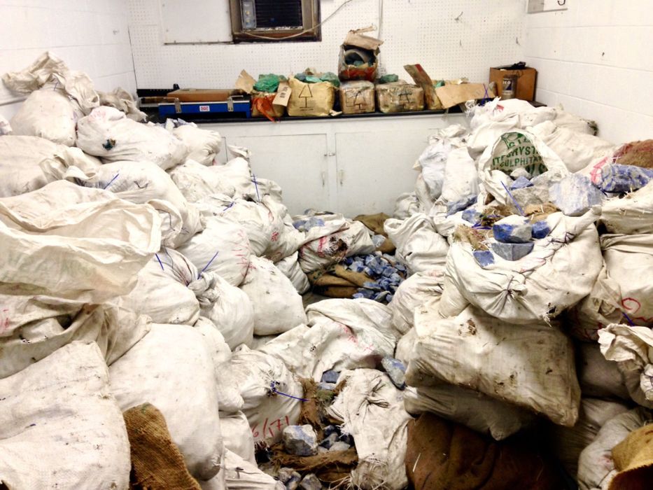 Das dürfte das Lager eines Händlers in Afghanistan sein. Ähnliche Aufnahmen konnte man in der Zeitschrift Lapis auch mal sehen. Die blauen Steine sind wahrscheinlich Lapislazuli.