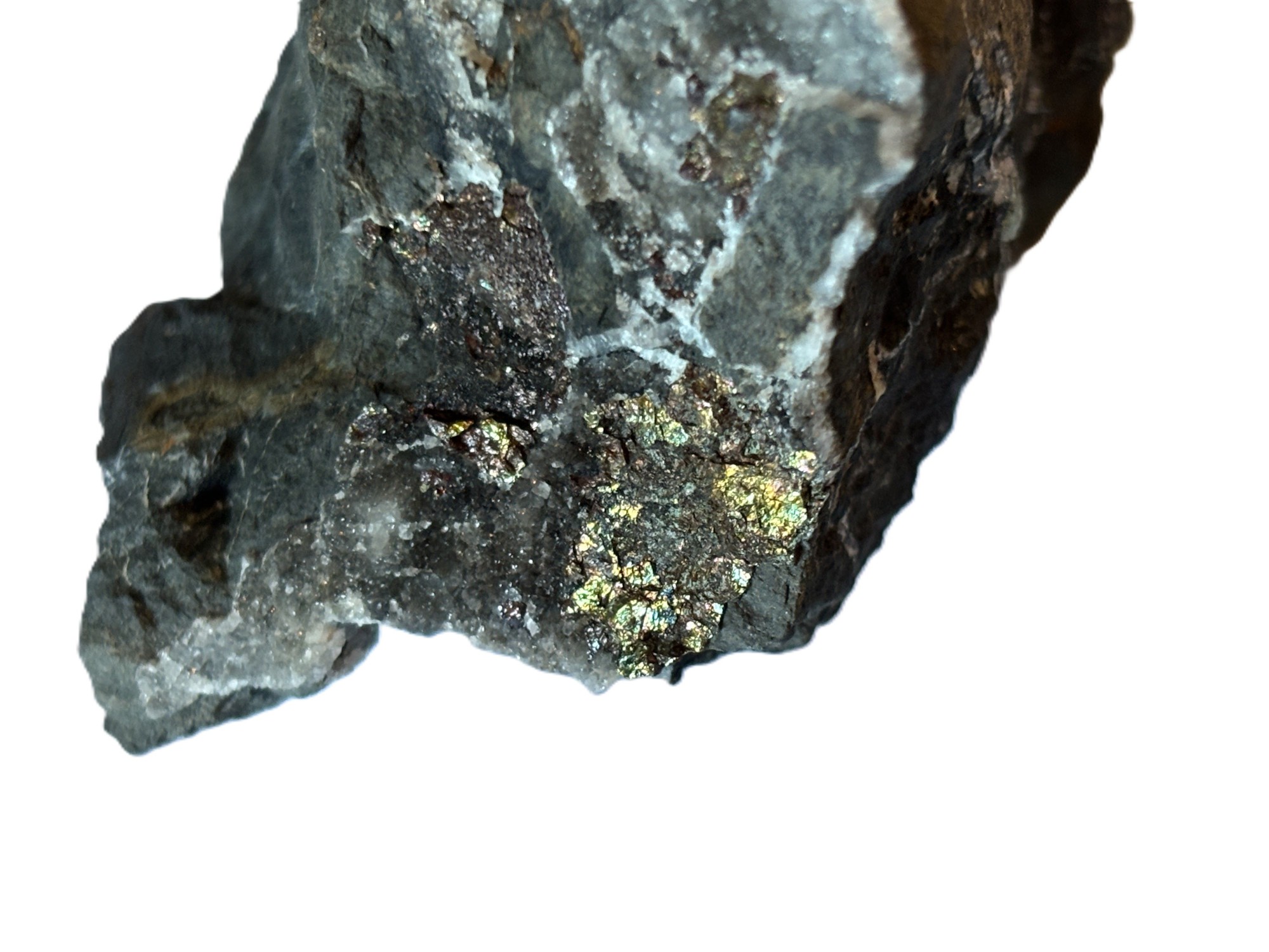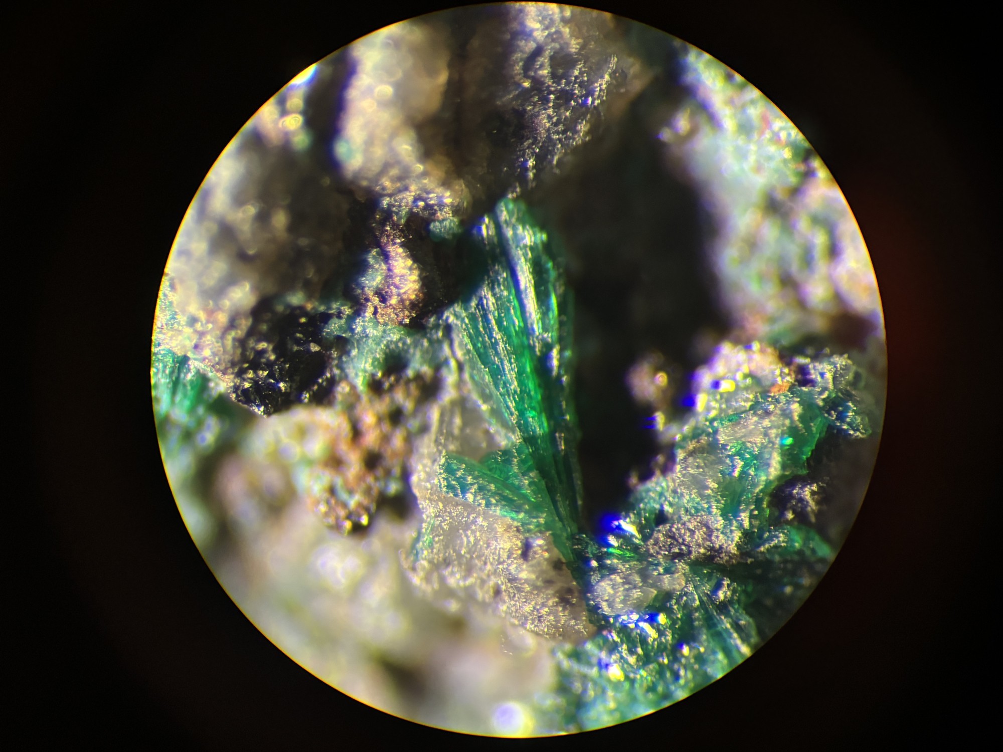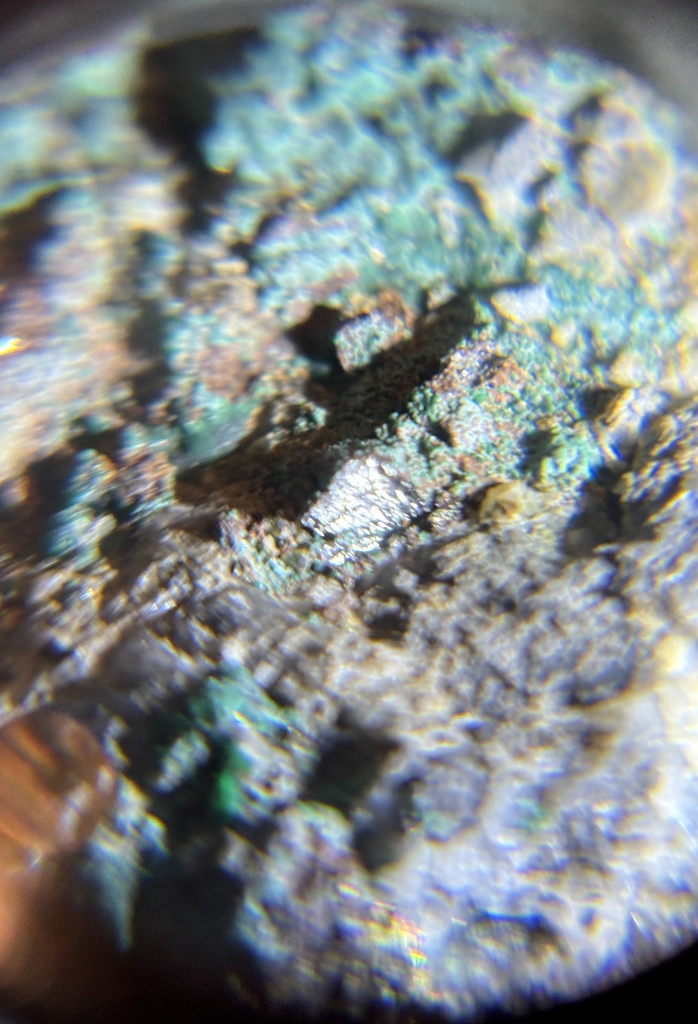 Dann habe wir noch, ich vermute stark Kupfererz gefunden, weil es so grün ist. Die Grube Boxbach wurde früher zur Kupfererzgewinnung betrieben, was dazu passen würde. Auf einer Seite war dann noch etwas metallisch rötlich schimmerndes zuerkennen. Könnte es sich dabei sogar um rein Kupfer handeln? Oder ist das Pyrit mit einem Überzug, der es nur rötlich erscheinen lässt.