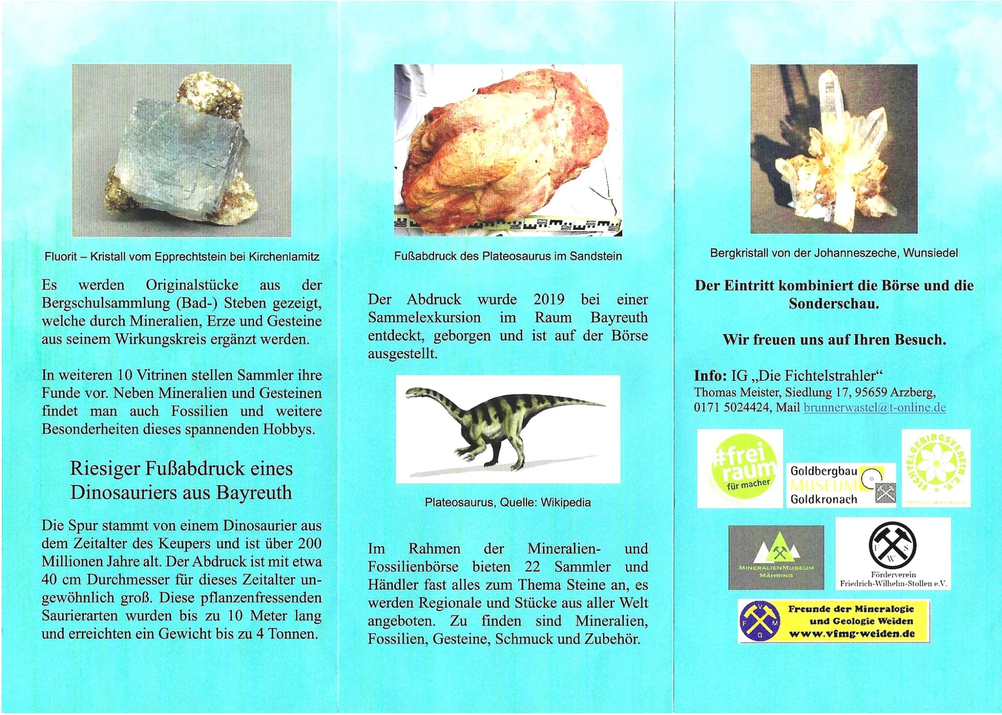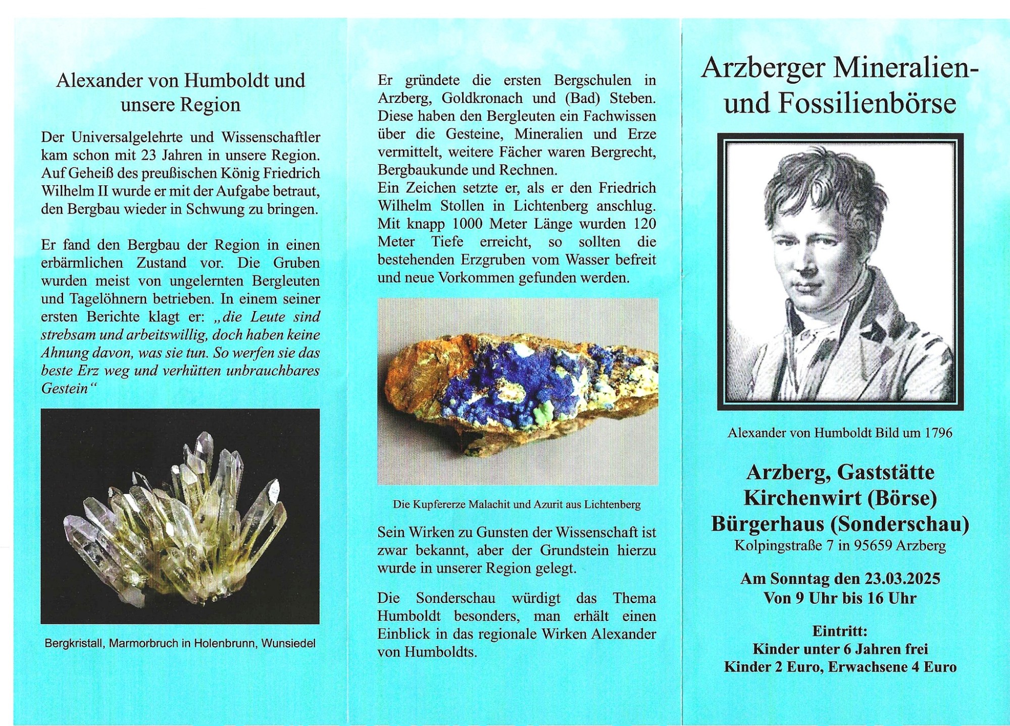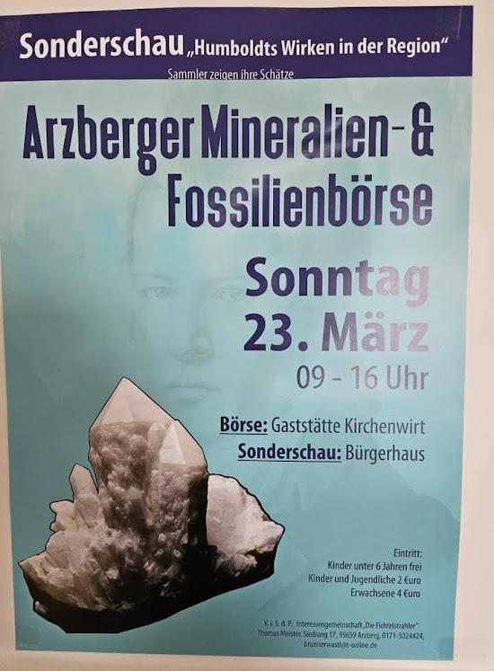 Im März findet heuer zum erstenmal in Arzberg im Fichtelgebirge eine Börse statt. Organisiert von einer Gruppe einheimischer Sammler,die sich "Fichtelstrahler" nennt. Da die traditionelle Börse in Marktleuthen nicht mehr stattfindet,