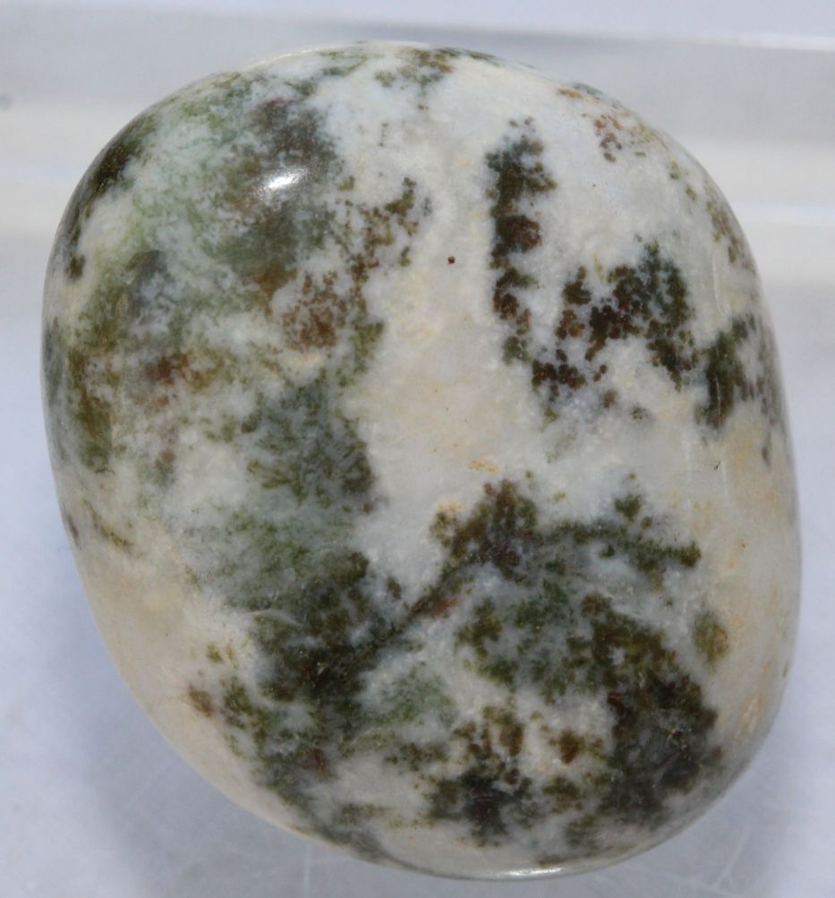 Habe gestern diesen evtl. Baumachat, aber denke eher nicht gekauft. Für Baumachat sollte er eher grüner sein. Auch hat er bräunliche und fast schwarze Farbe, könnte auch dunlegrün sein.. Die Maserung scheint mir fast Dendritenhaft.