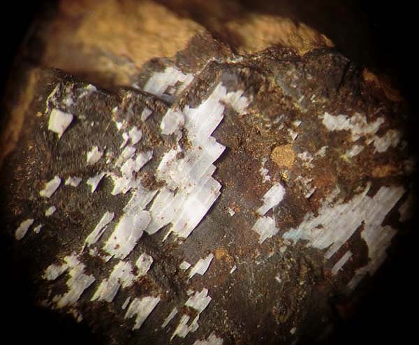 Mineralien mit Fundsituation: Als Raritäten auf Klüften mm-große schwarze Anatas-Kristalle, dunkelviolett parkettierte Fluorit-Würfel v. 0,5-1,5 cm,