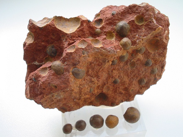 Bohnerz in Matrix und als herausgefallene Kugeln von Rammingen bei Ulm. |