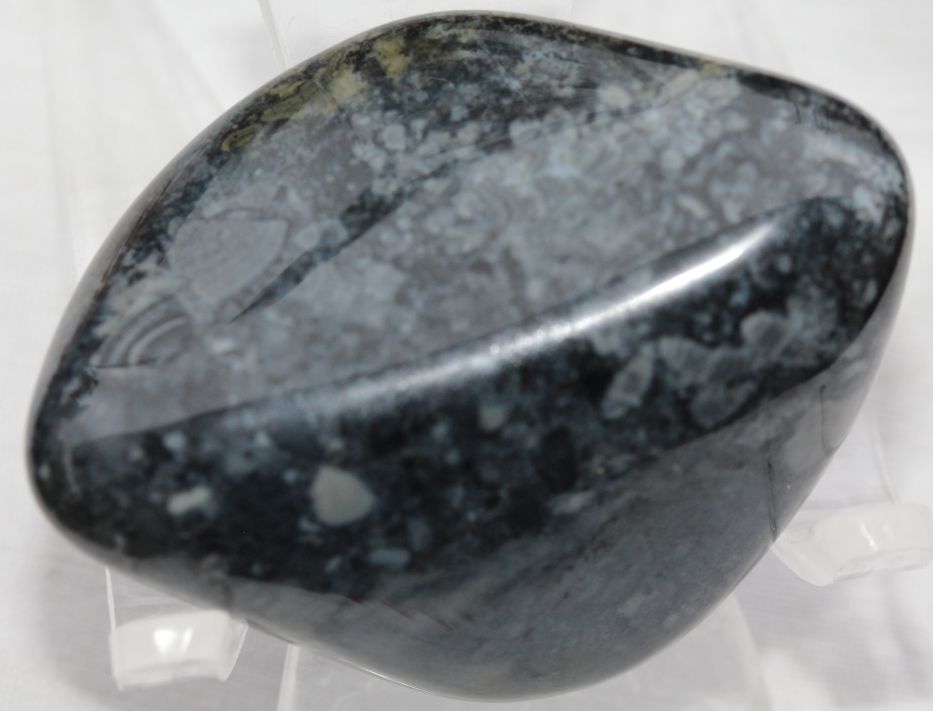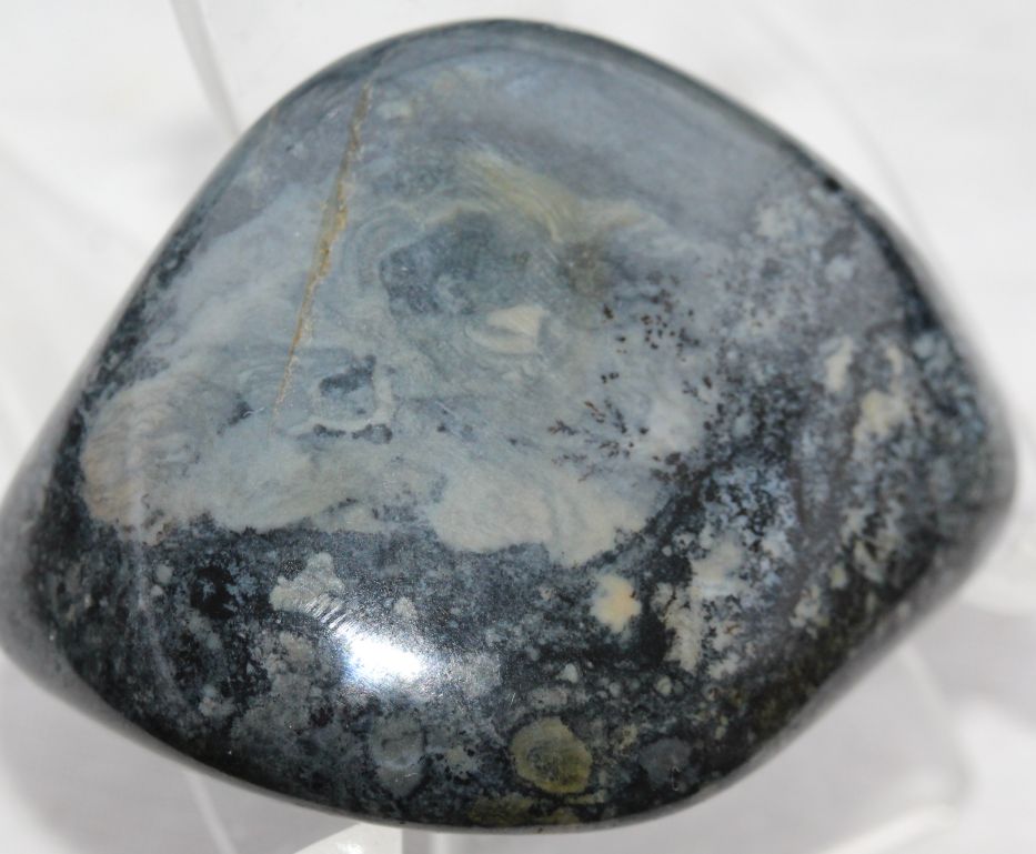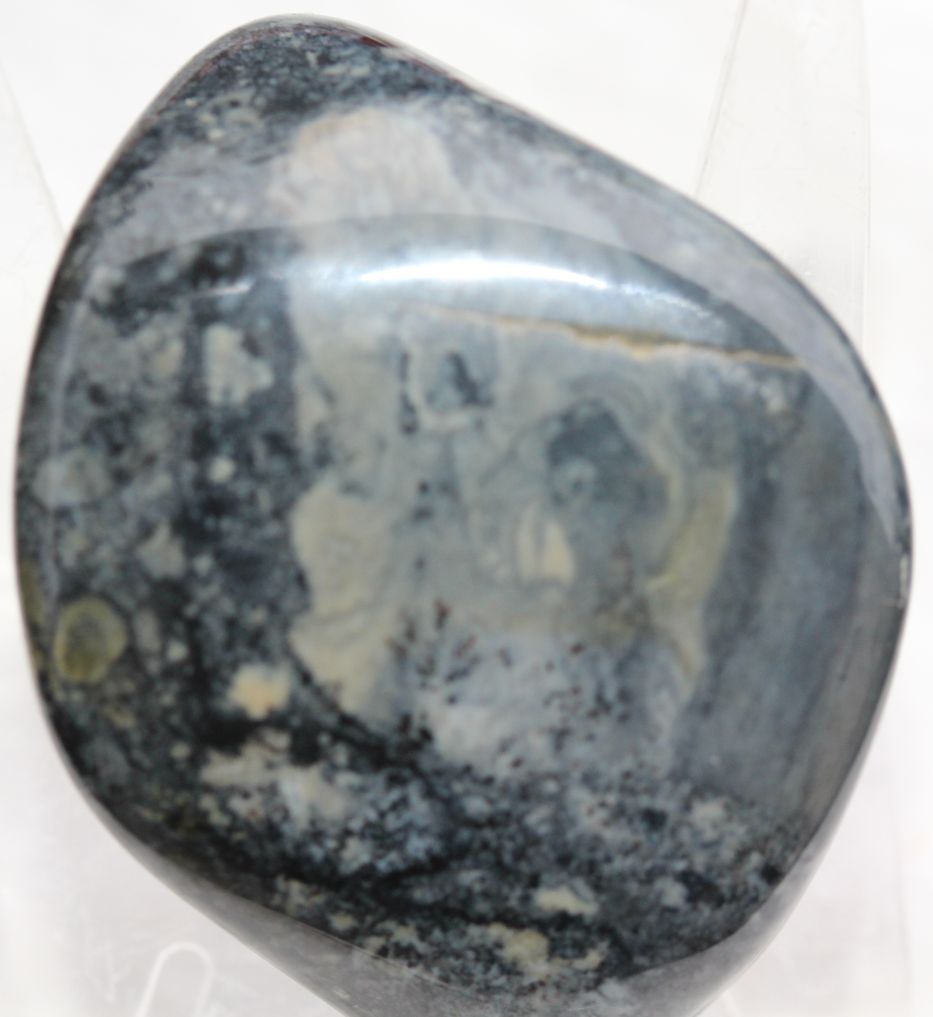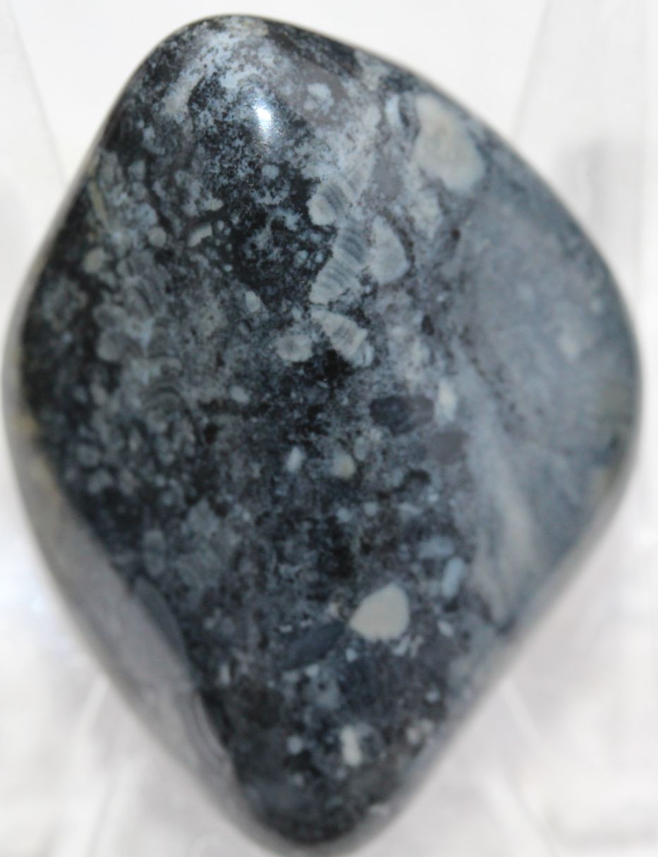 Indigo Gabbro, ein grobkörniges Gestein, das durch seine charakteristischen schwarz-weißen bis grauen Muster mit blauen oder violetten Reflexen auffällt. Er sei bekannt für seine beruhigende Energie, die spirituelles Wachstum fördern, Intuition stärken und zur Lösung emotionaler Blockaden beitragen soll. Das könnte er hier sein.
